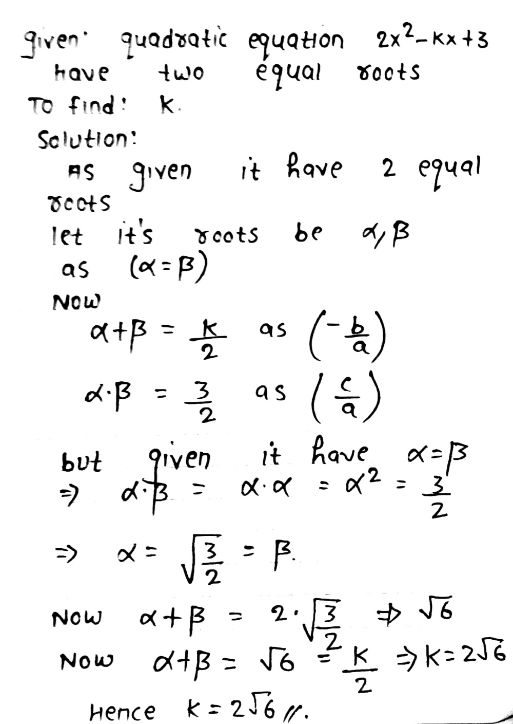 Q23 Find The Value Of K For The Quadratic Equation 2x 2 Kx 3 0 Suchthat It Has Two Equal Roots 2x 2 Kx 3 0 K Widehat Qt H 市3yaai不d Snapsolve